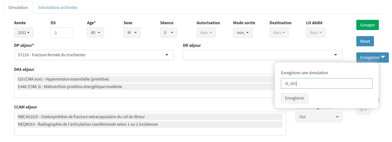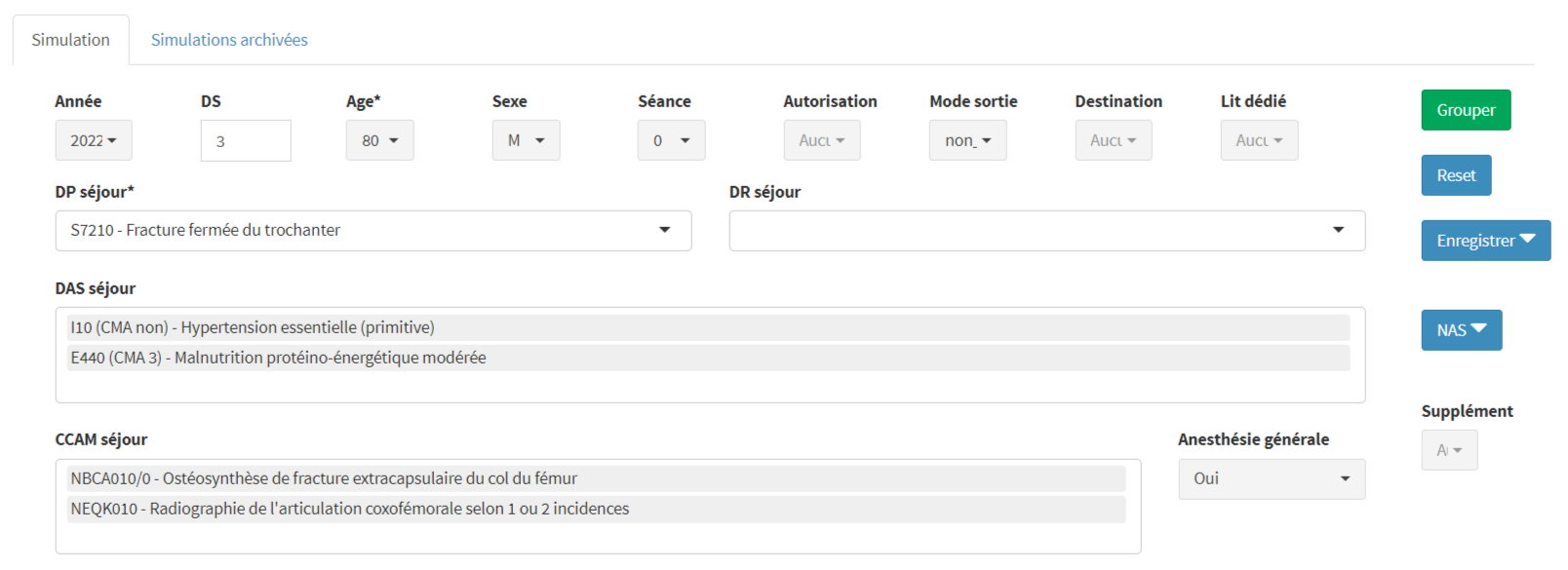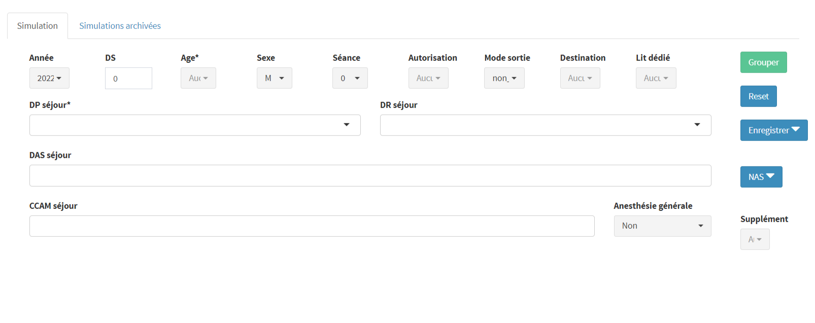 Le bouton “Grouper” ne devient cliquable et actif que si les 3 variables minimales (DS, DP séjour et âge) ont une saisie valide.